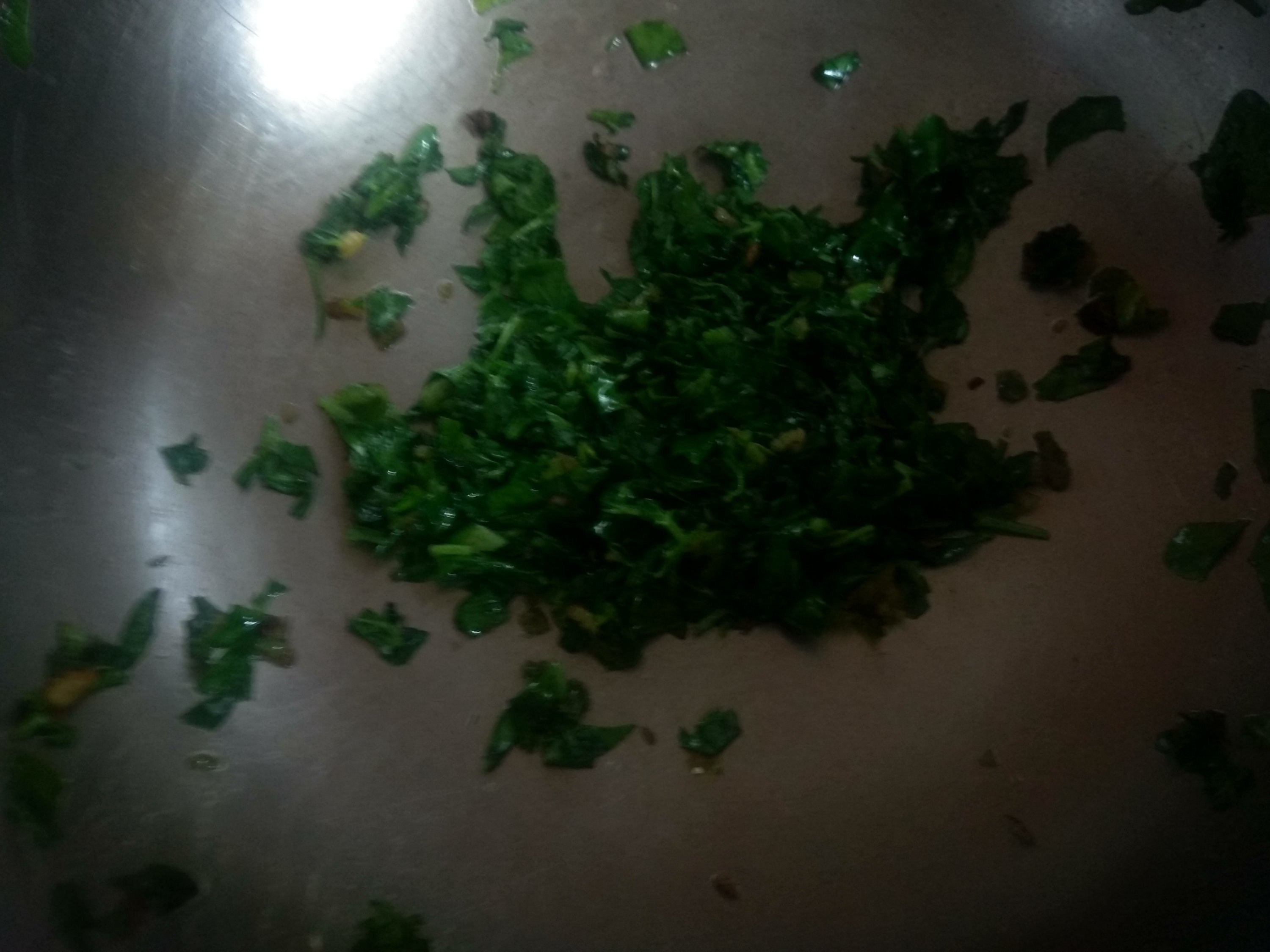 In a pan add ghee, when hot add asofatida, crushed ginger- chillies and methi leaves. saute it till it is glazed. (Become shiny,changes colour)